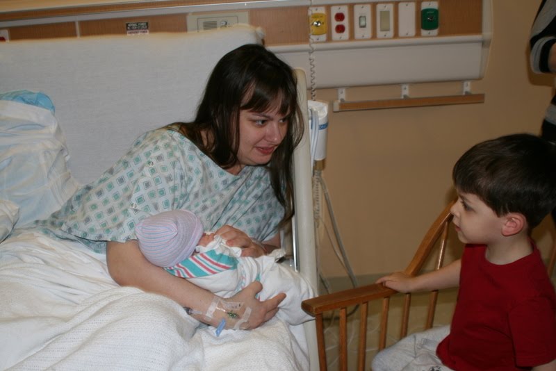 On Thursday, we were given the okay to go home. I was still having issues with the blood pressure but was given a prescription. We came home around one o'clock. Then around 3 o'clock James picked up Ben to take him home. Ben was shy again at first but then was happy to be home with all of us once again. He really didn't bother too much with his sister but would every now and then look at her or ask where she went if one of us handed her off to the other parent. He also got to hold her, as he had requested months before she was even born if he could. He was gentle and caring. He held her for a few moments before asking politely if we could get her.